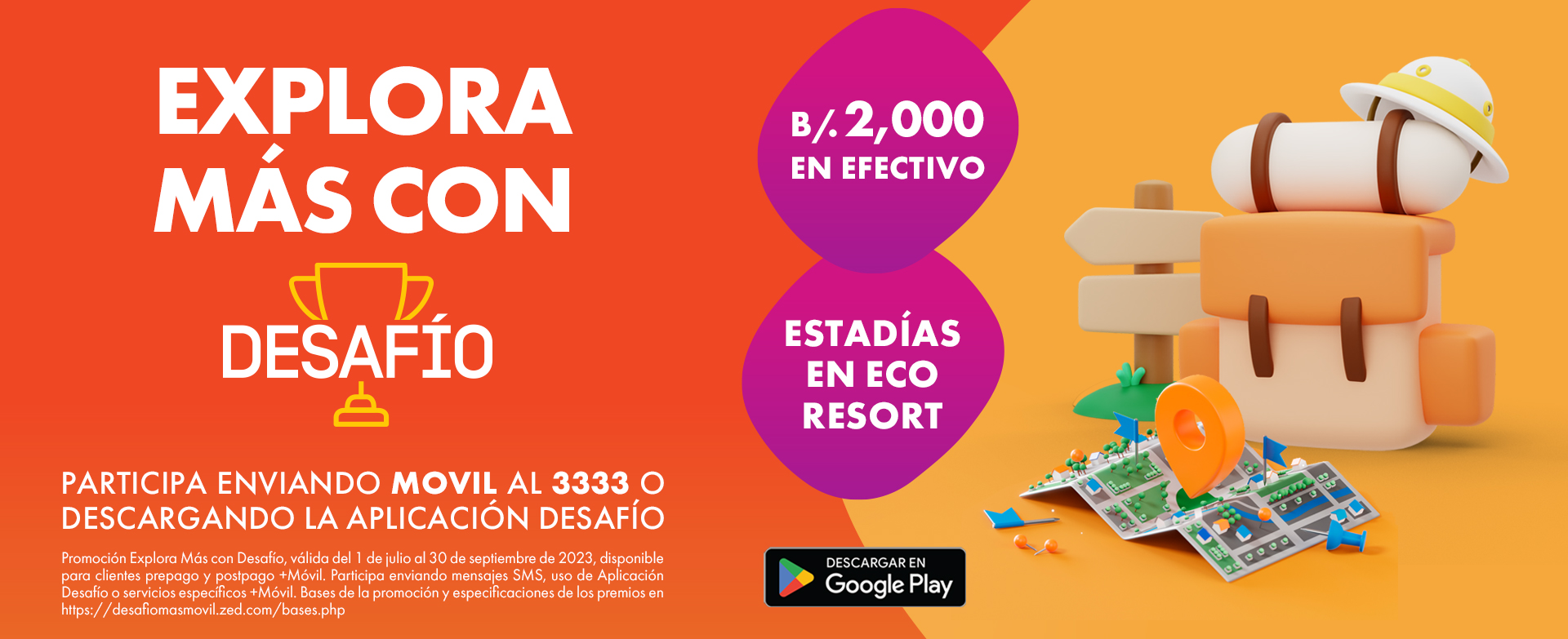 Promoción válida del 01 de julio al 30 de septiembre de 2023. Participan clientes +móvil postpago y prepago, mayores de 18 años que residan en la República de Panamá. Premios por habilidad y destreza: serán un total de nueve (9) ganadores; tres (3) ganadores de B/. 2,000, como primer lugar cada mes durante toda la vigencia de la promoción, tres (3) ganadores de una estadía en La Iguana Eco-Resort y B/. 200 en efectivo como segundo lugar cada mes y tres (3) ganadores de una estadía en La Iguana Eco-Resort y B/. 100 en efectivo como tercer lugar cada mes durante toda la vigencia de la promoción. Serán entregados a los clientes que resulten ganadores, de acuerdo al puntaje alcanzado en la fecha de corte, en las siguientes fechas: 01 de agosto de 2023 (3 ganadores); 01 de septiembre de 2023 (3 ganadores) y 02 de octubre de 2023 (3 ganadores). Se puede participar de cuatro (4) formas: (1) Activando planes de datos prepago de 1 día en adelante; (2) Recargando su cuenta celular prepago con una tarjeta +móvil o recarga electrónica de B/. 2.00 o más; (3) Enviando un mensaje de texto con la palabra MOVIL al 3333 y luego confirmar la suscripción enviando ALTA MOVIL al 3333; o (4) a través de la APP Desafío, la cual no tiene costo de descarga, en donde el cliente debe completar el registro y seleccionar la opción “Quiero Suscribirme”. Costo por suscripción B/.0.50 diarios que otorga 1 paquete de 4 preguntas; de no contar con saldo suficiente para cobrar los B/.0.50 diarios, la plataforma de suscripción tendrá como alternativas automáticas, mientras esté suscrito, aplicar alguna de las siguientes tarifas parciales según saldo disponible: B/. 0.25 asignará 3 preguntas, B/. 0.15 asignará 2 preguntas o B/. 0.05 asignará 1 pregunta. Si no desea recibir mensajes, puede enviar gratis la palabra BAJA MOVIL al 3333, cancelando su participación en la promoción o en el APP seleccionando la casilla “check” a la opción de “Desafiliarme”. Aplican usuarios que hayan activado con OK al 3335, costo B/. 0.20, las formas de participación (1), (2) y los suscritos en la forma de participación (3) y (4) antes detallada, que respondan a las trivias por SMS y/o uso de las vidas desde la aplicación Desafío donde cada acierto se obtiene 10, los desaciertos no dan puntos. Dichos puntos aplicarán para la selección de ganadores por habilidad y destreza. Aplica un único MSISDN y/o dispositivo móvil por cliente participante, que podrá optar por un máximo de un (1) premio por habilidad y destreza durante el periódo de la promoción del 01 de julio al 30 de septiembre de 2023. Las fechas de entrega de premio pueden ser modificadas por factores exógenos a Cable & Wireless Panamá, S.A. y debidamente comunicado a los participantes. Los premios en efectivo serán entregados por medio de cheque en la tienda +móvil de mayor conveniencia para el cliente a nivel nacional, o bien, por transferencia ACH, previa aceptación del premio por parte del ganador, confirmando vía correo electrónico o formulario web, debidamente completado. Para más detalles de formas de participación, fechas de selección y comunicación de ganadores, limitaciones, restricciones, condiciones especiales y demás visita: https://desafiomasmovil.zed.com/bases.php